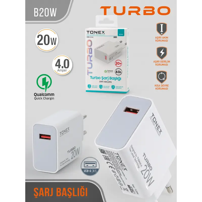 Tonex B20W Cep Telefonu USB-A Hızlı Şarj Aleti Başlık 20W 4A