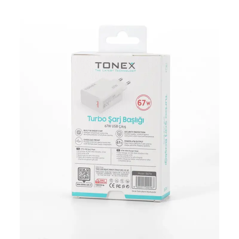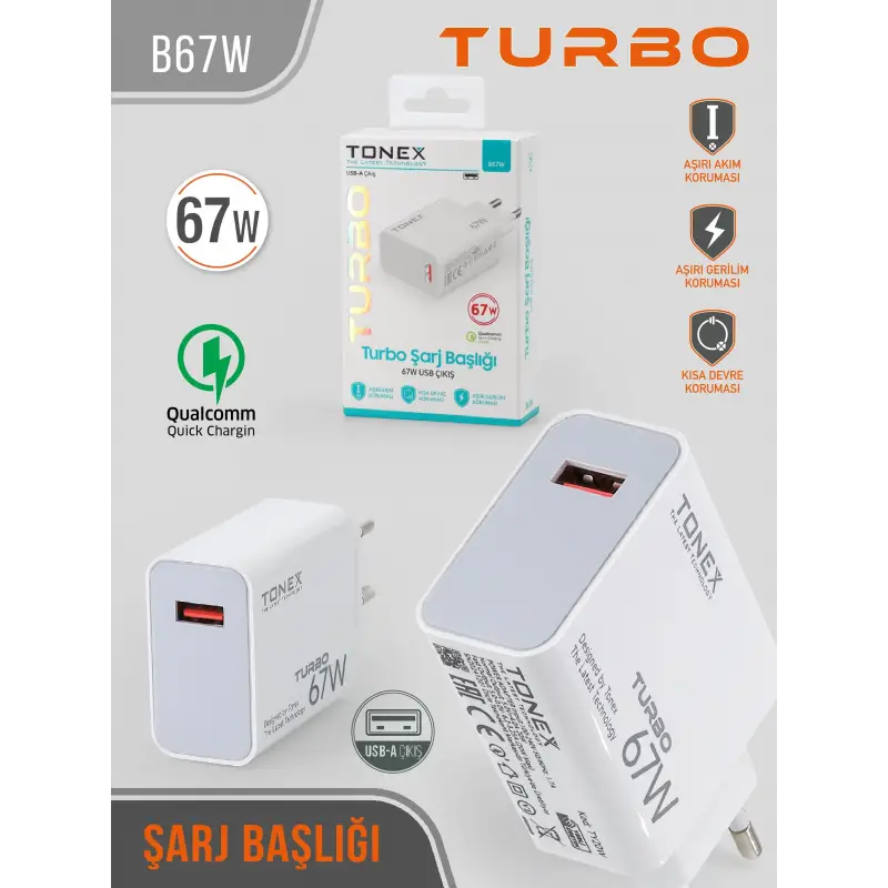 Tonex B67W Cep Telefonu USB-A Max Turbo Hızlı Şarj Aleti Başlık 67W