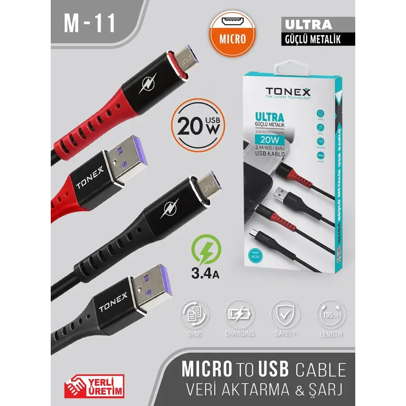 Tonex M11 Cep Telefonu Şarj Kablosu Micro USB Ultra Güçlü Metalik Kablo 20W