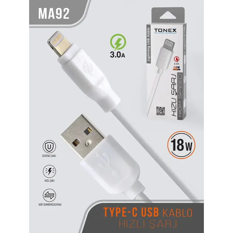 Tonex MA92 Cep Telefonu Şarj Kablosu Lightning USB Kablo 18W