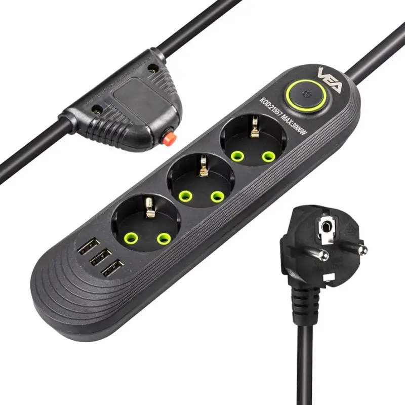 VEA VA-21557 Akım Korumalı Priz 3xUSB Harici Anahtarlı 3Lü 1.5 Metre Siyah 3000w