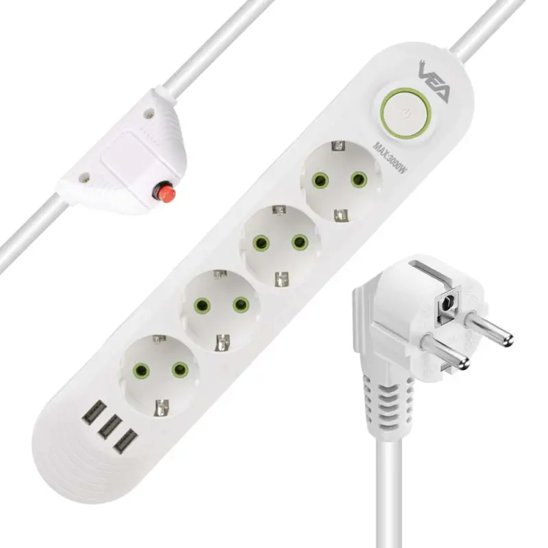 Vea VA-21560 Akım Korumalı Priz 3xUSB Harici Anahtarlı 4Lü 1.5 Metre Beyaz 3000w