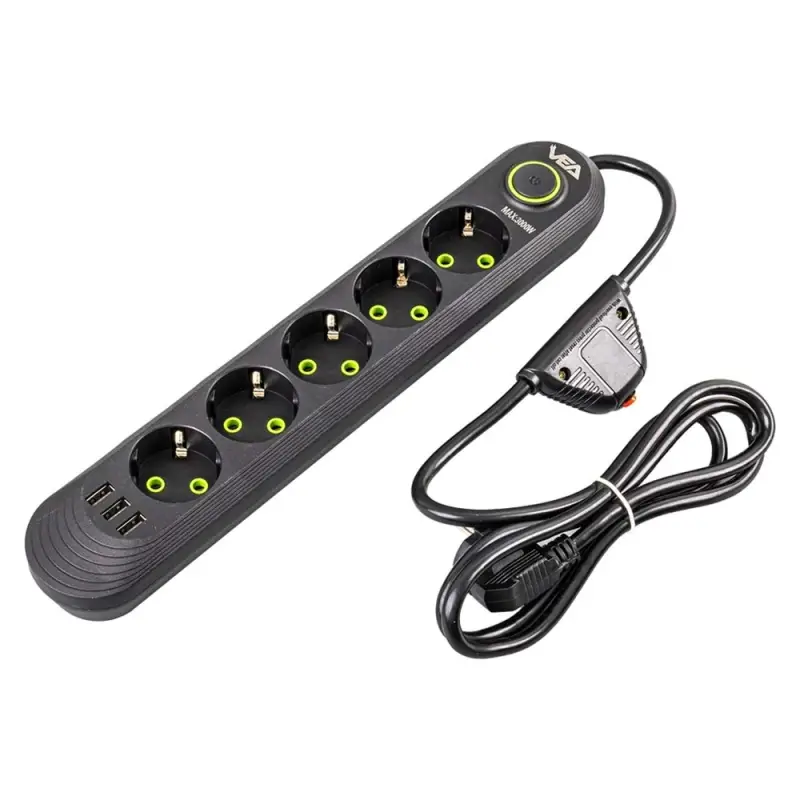 Vea VA-21561 Akım Korumalı Priz 3xUSB Harici Anahtarlı 5Li 1.5 Metre Siyah 3000w