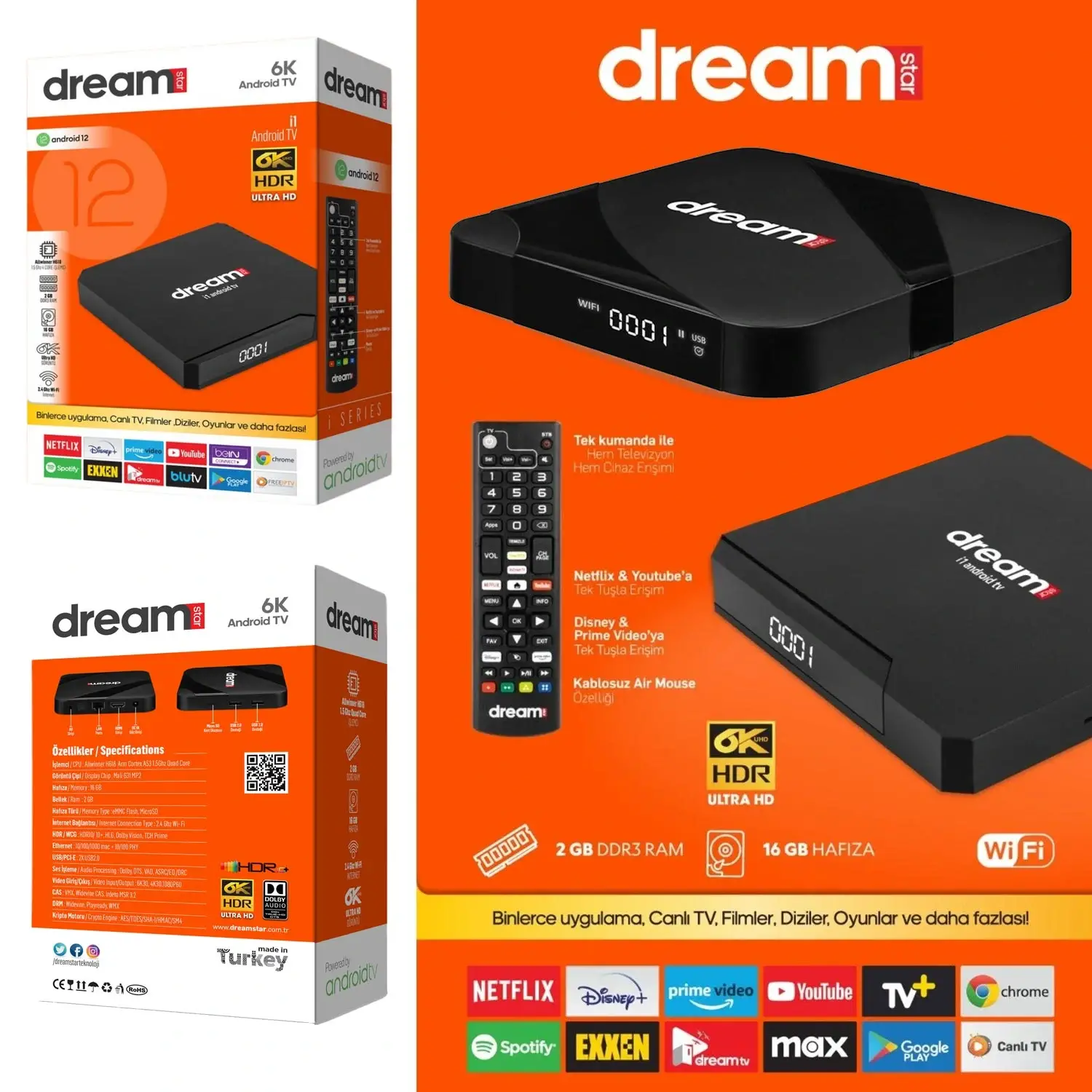 DREAMSTAR I2 ANDROİD TV BOX *Android12 Versiyon *Allwinner H618 1.5 Ghz 4 Çekirdekli İşlemci *2 Gb Ram *16 Gb Dahili Bellek *Wi-fi ve Bluetooth Desteği 2 yıl garanti My Dream Tv Sayesin de i p tv içeriklerine Hızlı erişim imkanı 1 Yıllık Free İ p Tv Hediye (Yerli Platform İçermez) Web sayfalarında gezebilir, Netflix üyeliğinizi kullanabilir, Yo u tube 4k ile tüm videoları izleyebilir. Bu ürün ile usb 2.0 soketlerini kullanıp harici diskinizdeki film, müzik ve fotoğraflarınızı kullanabilirsiniz. Google Play store üzerinden indireceğiniz tüm uygulama yüksek donanımı sayesinde kullanabilirsiniz. Bein connect, Netflix, Blue Tv, Kodi, Türkvod, Seyirtürk Vb. Tüm android uygulamaları kullanabilir 4K filmleri izleyebilirsiniz. Kutu İçeriği: *Dreamstar i1 Android Tv Box *Adaptör *Kumanda *Hdmı Kablo 2.0 *Kolay Kurulum Klavuzu ve Garanti Belgesi *2 Ad ince Kalem pil Uydu AlıcısıYok Android SürümAndroid 12 BluetoothVar Wi-fiWi-fi 2,4 Ghz İşlemciAllwinner Ram TipiDDR 4 Hafıza16 Gb Ram2 Gb Ram Usb 3.0 DesteğiYok Optik Ses GirişiVar Usb 2.0 DesteğiVar Görüntü Çözünürlüğü4K Uhd Garanti Süresi (Ay)24 Ay