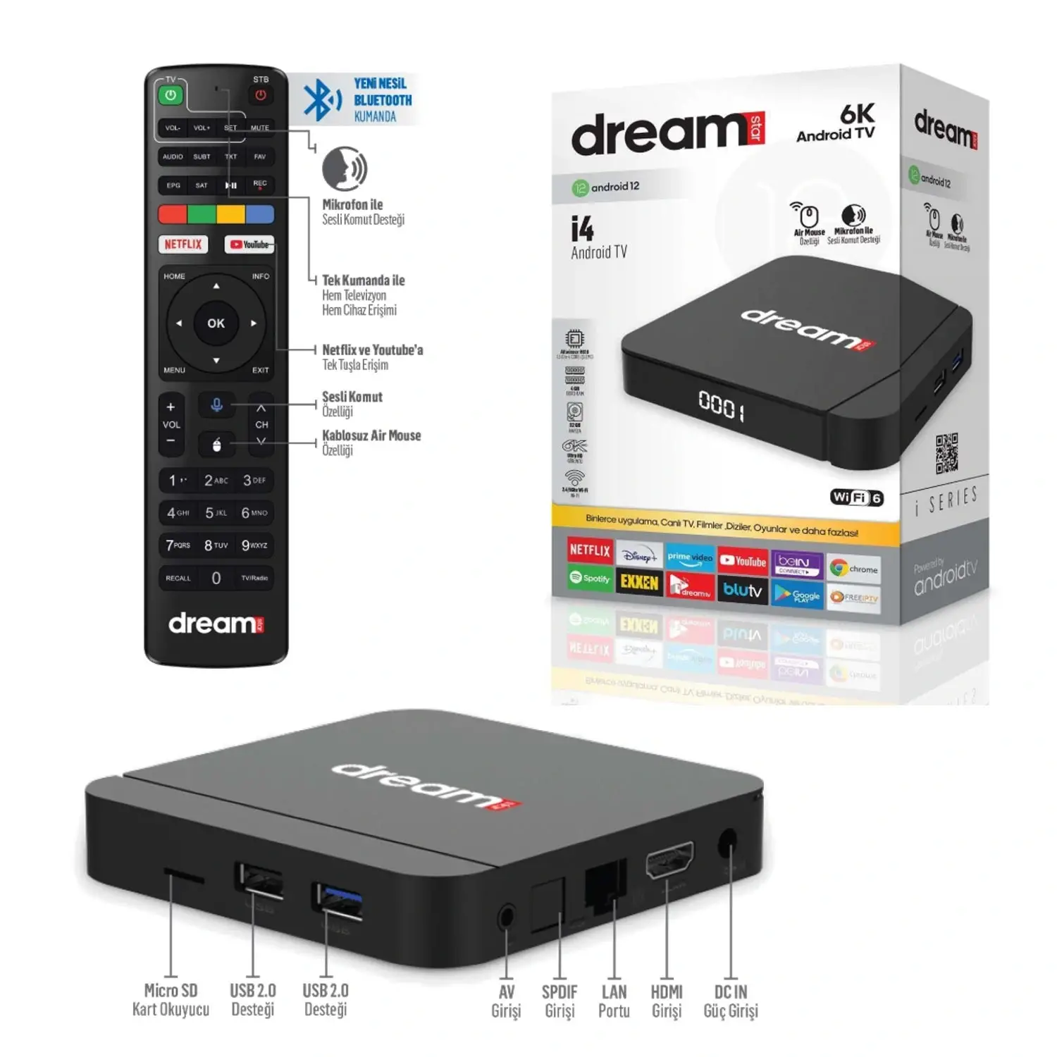 İŞLETİM SİSTEMİ ANDROID 12 İŞLEMCİ ALLWİNNER H618 1.5 GHZ QUAD CORE eMMC FLASH HAFIZA 32 GB RAM 4 GB DDR3 RAM KRİPTO MOTORU AES/TDES/SHA-1/HMAC/SM4 USB / PCI-E 2 X USB2.0 CAS WMX,WİDEVİNE CAS,IRDETO MSR 3.2 HAFIZA TÜRÜ EMMC FLASH,MİCRO SD VİDEO GİRİŞ/ÇIKIŞ 6K30 , 4K30 , 1080P60 ETHERNET 10/100/1000 mac + 10/100 PHY SD KART OKUYUCU VAR DAHİLİ BLUETOOTH BLUETOOTH 5,0 KABLOSUZ WiFi DAHİLİ 2.4/5 GHz SES İŞLEME DOLBY,DTS,VAD,ASRC/EQ/DRC HDR/WCG HDR10/10+,HLG,DOLBY VİSİON,TCH PRİME KUMANDADA SESLİ KOMUT VAR NETFLİX VAR FREE İPTV VAR DİSNEY PLUS VAR AMAZON PRİME VAR CHROME VAR YOUTUBE VAR