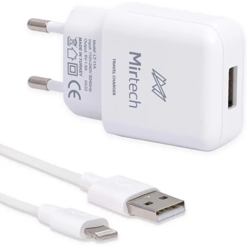 Mirtech LT11A hızlı şarj USB şarj cihazı ve USB A Lightning şarj kablosu 1 Metre 521028