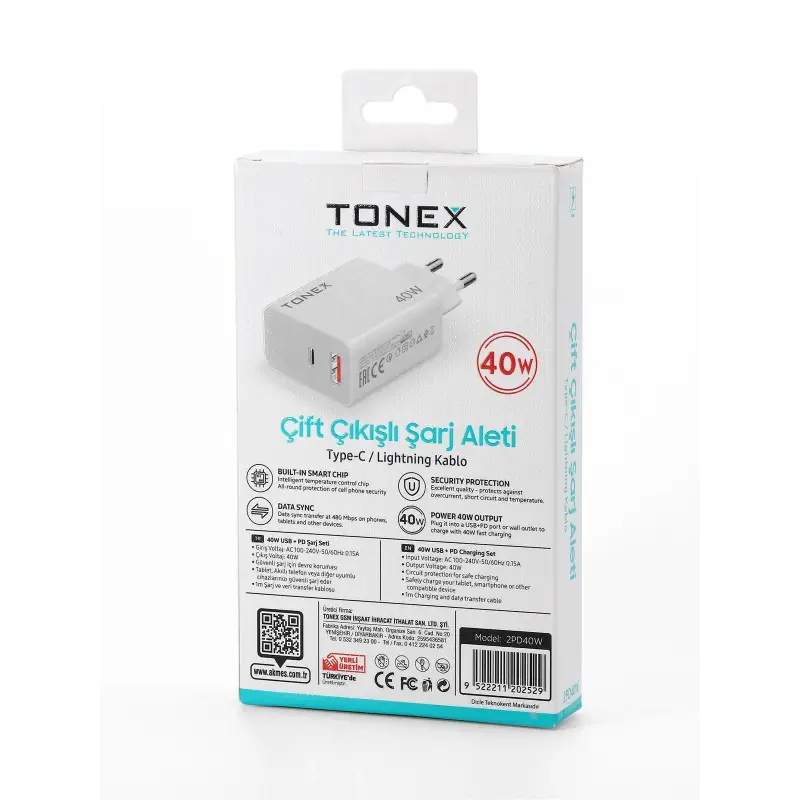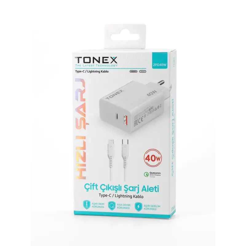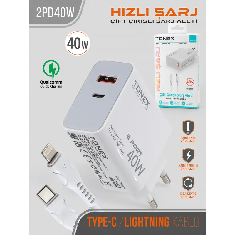 Tonex 2PD40W Cep Telefonu Lightning TYPE-C Hızlı Şarj Aleti 40W Set Çift Çıkış