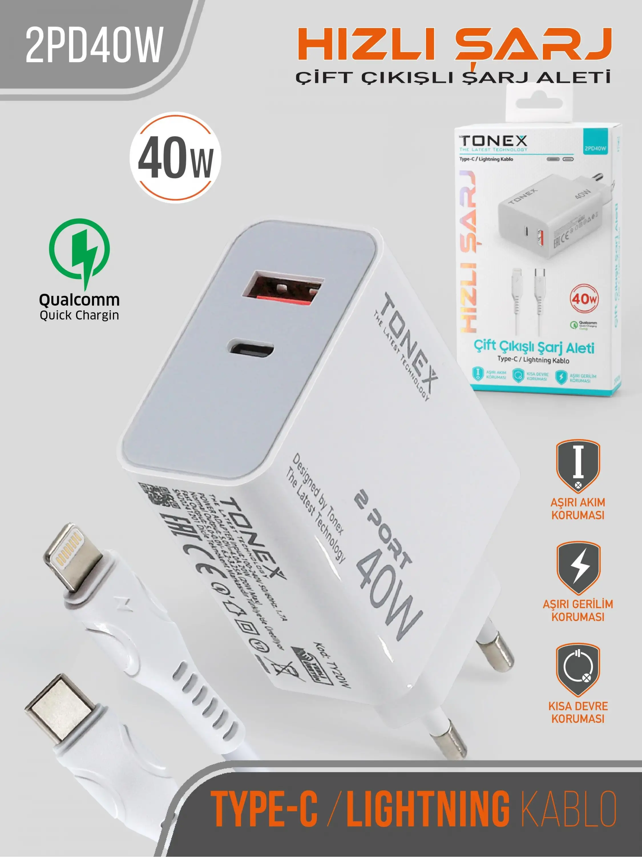 20W PD Giriş 20W Usb-A Giriş toplamda 40W iki girişli aynı adan iki cihazı 40W Şarj etme gücüne sahip TURBO özellikli Adaptör ve Typ-c to Lightning kablosuyla beraber TURBO özellikli Şarj aleti
