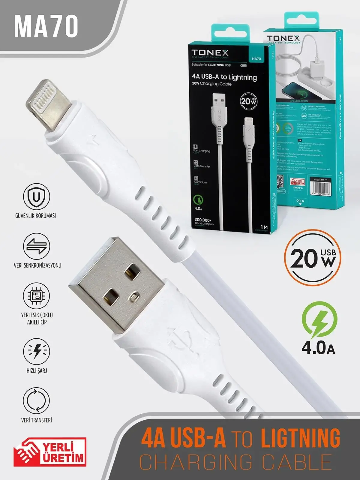 Tonex MA92 Cep Telefonu Şarj Kablosu Lightning USB Kablo 18W