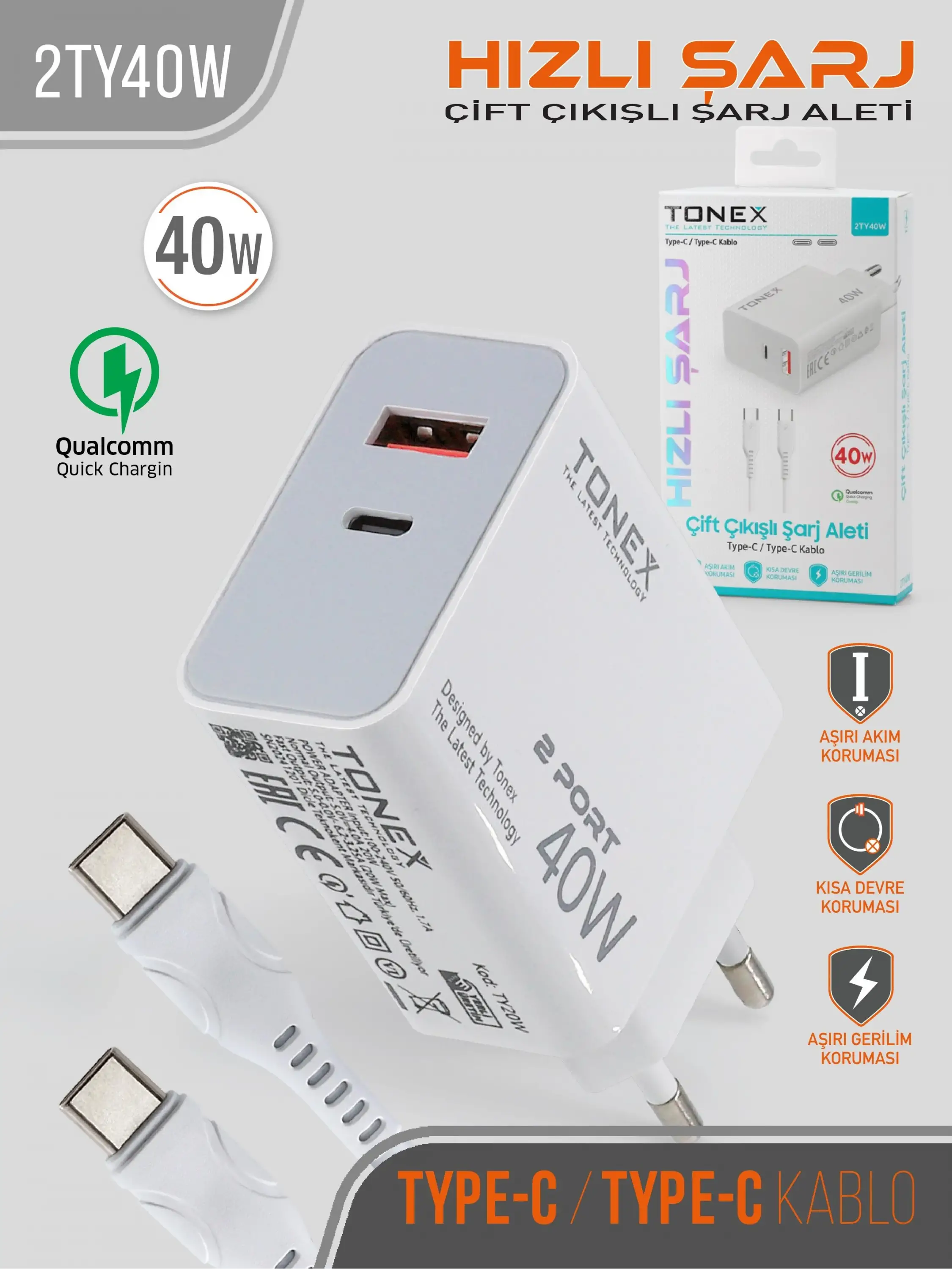 20W PD Giriş 20W Usb-A Giriş toplamda 40W iki girişli aynı adan iki cihazı 40W Şarj etme gücüne sahip TURBO özellikli Adaptör ve Typ-c to Тур-с kablosuyla beraber TURBO özellikli Şarj aleti