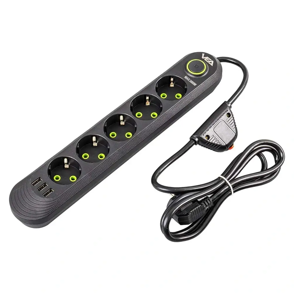 VEA VA-21557 Akım Korumalı Priz 3xUSB Harici Anahtarlı 3Lü 1.5 Metre Siyah 3000w